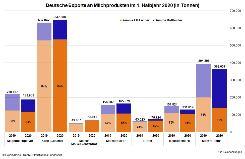Es ist so weit: Die Halbjahresergebnisse für den Außenhandel liegen vor. In diesem Jahr mit größerer Spannung erwartet, um die Effekte der Corona-Krise messbar zu machen.Die gute Nachricht zuerst: Die Exportmengen einiger wichtiger Produkte wie Käse, Milchmischgetränke, Butter und Molkenprodukte konnten das Vorjahresergebnis zum Teil erheblich toppen. Käse erzielte immerhin ein Plus von 2,4 Prozent, Butter sogar eine Steigerung von 20 Prozent.