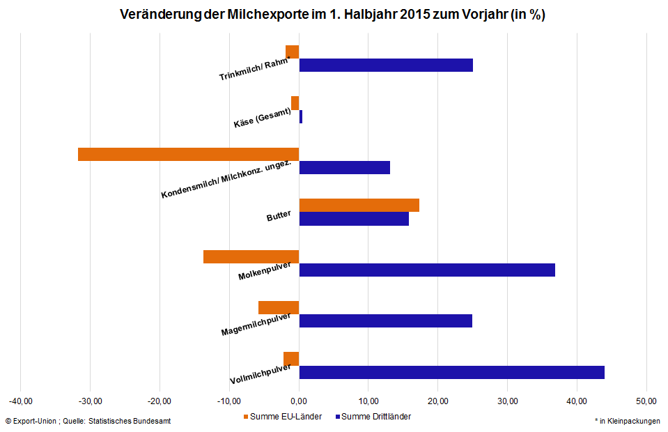 Ebenfalls sehr positiv haben sich die Ausfuhren von abgepackter Milch und Rahm mit einem Plus von über 4 Prozent entwickelt. Besonders China steigerte seine Einfuhren um über 33 Prozent auf fast 89.000 t im ersten Halbjahr 2015. Die Ausfuhren in Drittländer insgesamt stiegen nicht zuletzt dadurch um 25%.