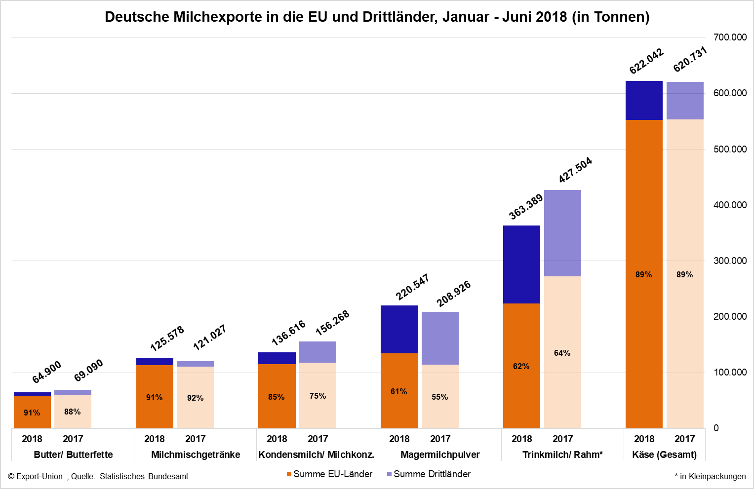 Die Exporte im ersten Halbjahr 2018 verliefen aus Sicht der deutschen Molkereien vergleichsweise mäßig. Teils blieben die Ausfuhrmengen von Milchprodukten auch aufgrund des starken internationalen Wettbewerbs hinter dem Vorjahresergebnis zurück, wie beispielsweise die Exporte von Kondensmilch. Lichtblicke waren dagegen die Entwicklungen bei Magermilchpulver und Milchmischgetränken.Auch wenn die aus deutschen Molkereien ausgeführten Käsemengen in die gesamte Welt knapp das Vorjahresniveau halten konnten, so ist dies dennoch positiv hervorzuheben, da sich die Mengen auf einem sehr hohen Niveau befinden.